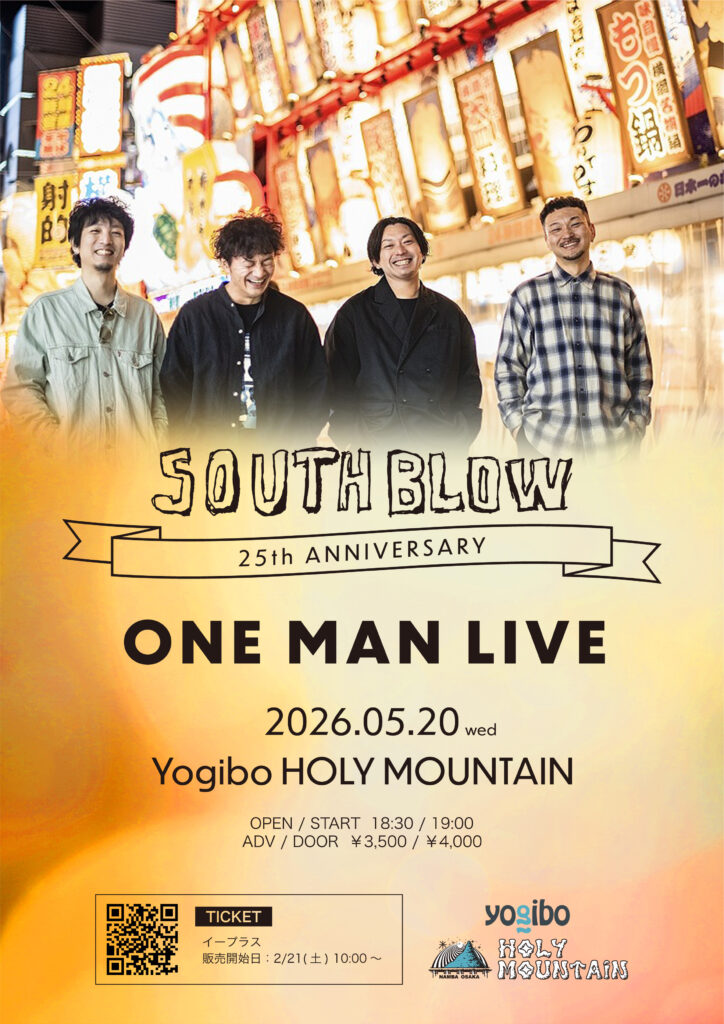 投稿日: 投稿者: SOUTH BLOW OFFICIAL2026.05.20.Wed.【5th Anniv. ONE MAN】難波Yogibo HOLY MOUNTAIN SOUTH BLOW 25th ANNIVERSARY ONE MAN LIVE SOUTH BLOW open/start 18:30/19:00adv./door ¥3,500/¥4,000 ①手売り ②e+ e+(2/21 10:00~)